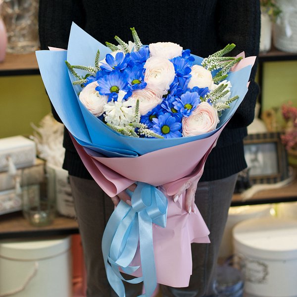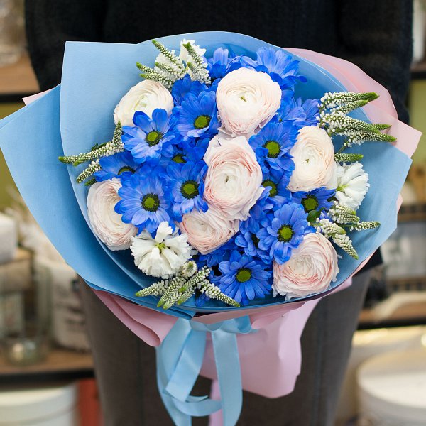 Букет из синей хризантемы, нежных ранункулусов, вероники в подарочной упаковке.