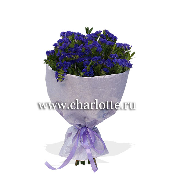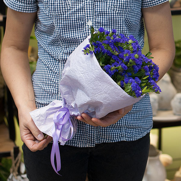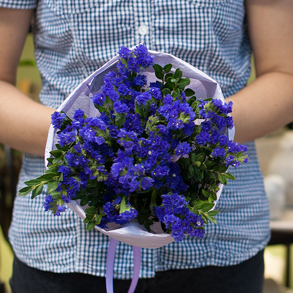 Букет из синей статицы, декоративной зелени в жатой бумаге крафт.