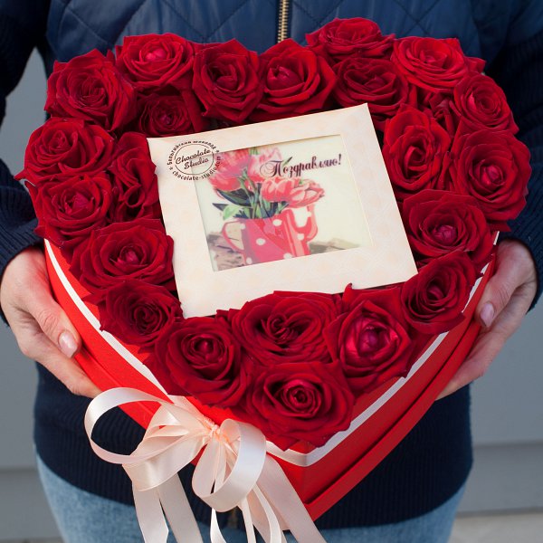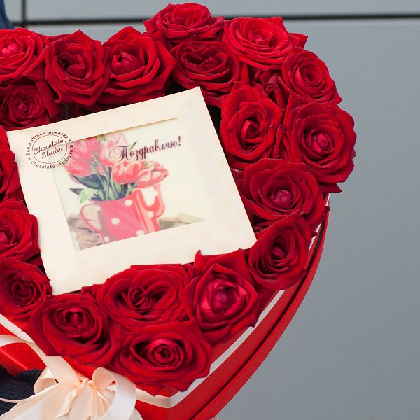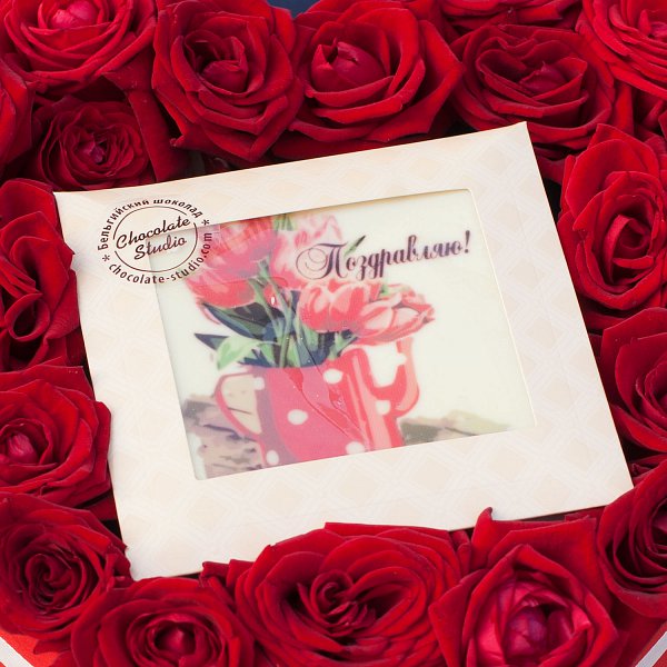 В комплекте с букетом идет шоколадная открытка, что делает подарок еще более приятным и запоминающимся.