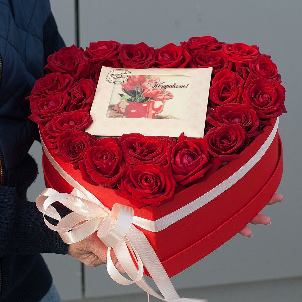 Коробка-сердце, в которую упакован букет, добавляет нотку романтики и делает подарок еще более особенным.