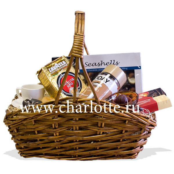 Корзина с кофе и шоколадом. По Вашему желанию состав корзины можно изменить, для этого звоните в наши салоны цветов или указывайте в разделе "комментарии для флориста" при заказе через интернет.