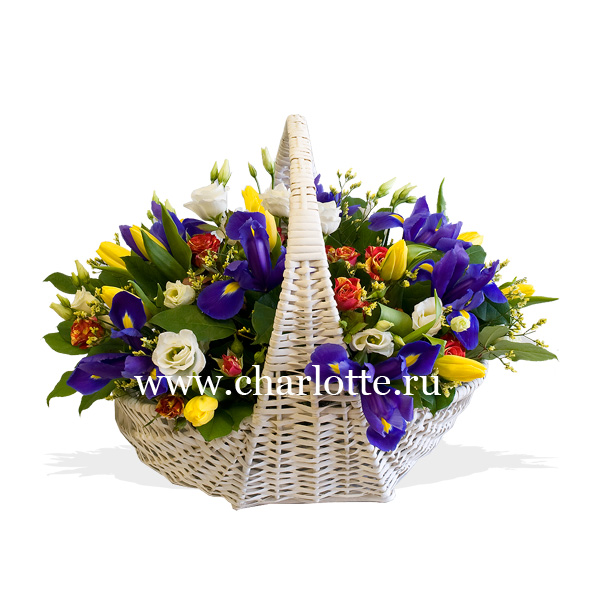 Корзина из синих ирисов, белых лизиантусов, кустовых роз, желтых тюльпанов, статицы с зеленью в корзине. По Вашему желанию цветовую гамму композиции можно изменить, для этого звоните в наши салоны цветов или указывайте в разделе "комментарии для флориста" при заказе через интернет.
