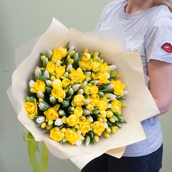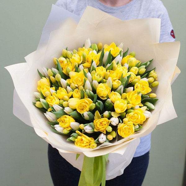 Букет состоит из 129 желтых нарциссов и белых тюльпанов, которые гармонично сочетаются в дизайнерской упаковке. Это создает неповторимую атмосферу и подчеркивает индивидуальность подарка.