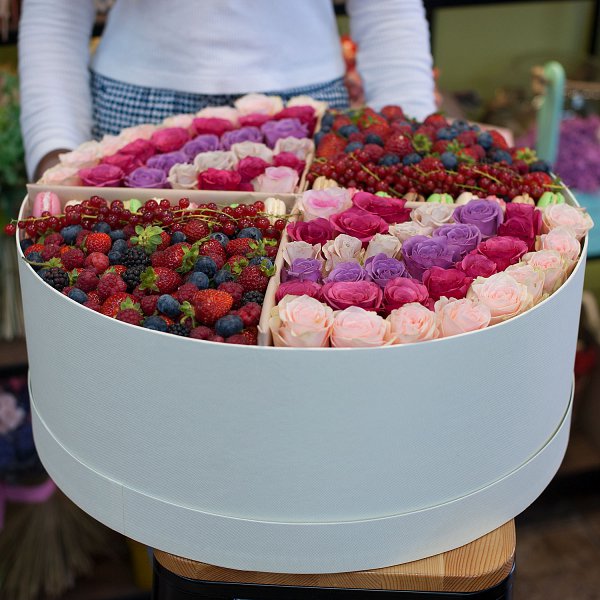 Подарочная коробка с ягодами, пирожными макарунами и цветами.