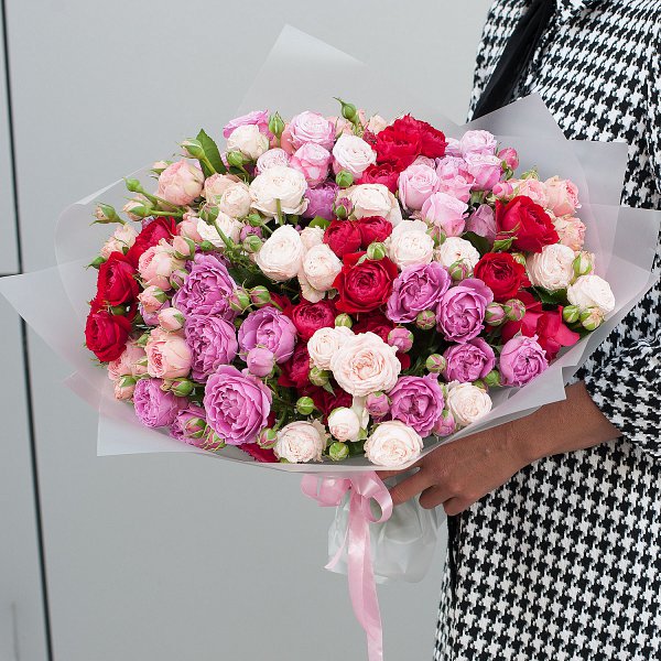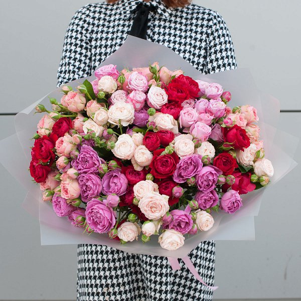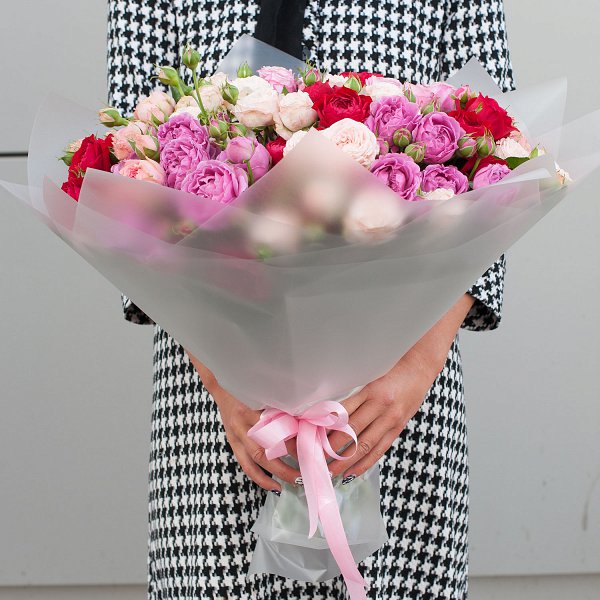 Букет из разноцветных кустовых пионовидных роз "Яркие краски" - это стильный и элегантный подарок, который подойдет для любого повода.