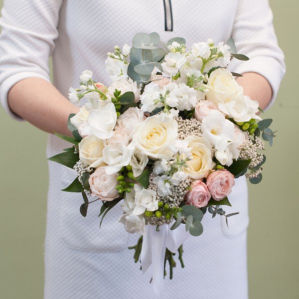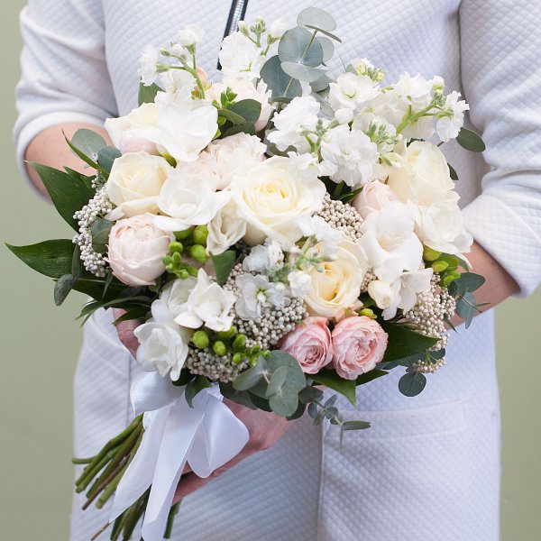 Букет невесты в бело-розовых тонах из, белых фрезий, озатамнуса, белой кустовой матиоллы, белых роз аваланж, нежно-розовых роз Бомбастик с декоративной зеленью с открытыми ножками.