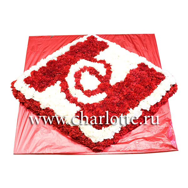 Композиция в виде логотипа Спартака из гвоздик (красных и белых).
