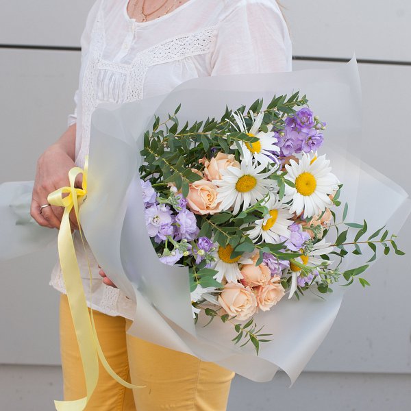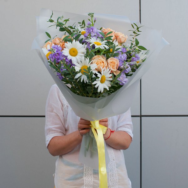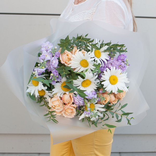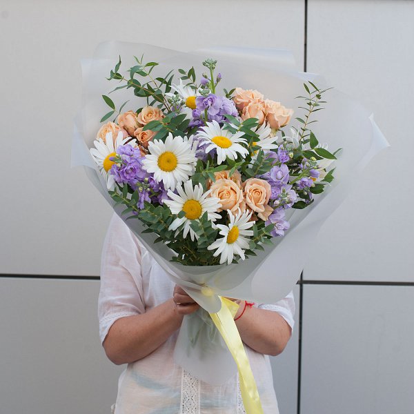 Букет "Лето от кутюр" - это сборный букет, состоящий из ромашек, маттиолы и кустовых роз с эвкалиптом.
