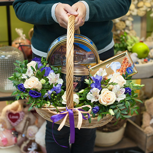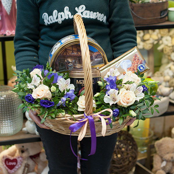 Композиция в бело-кремовых тонах из роз, фрезий, лизиантусов, альстромерии с декоративной зеленью в корзине в качестве подарков использованы чай в жестяной банке, печенье в жестяной банке, шоколад "Lindt" 250 гр.