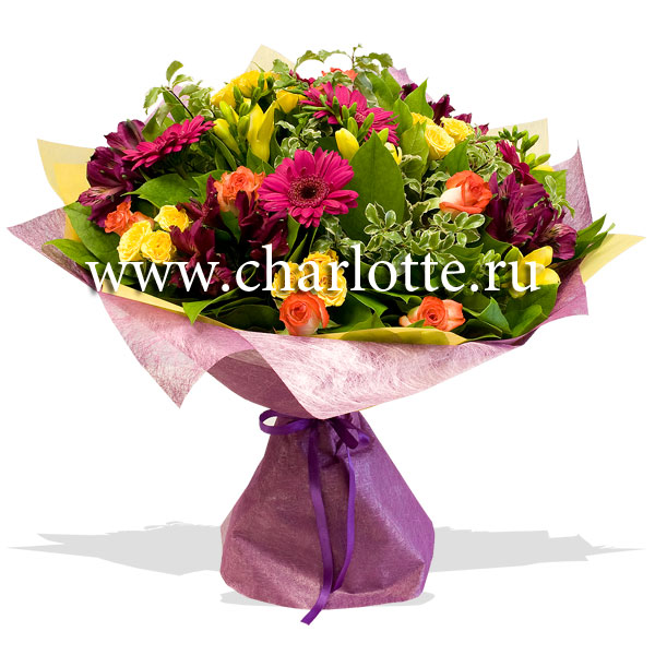 Букет в желто-малиновых тонах из роз, кустовых роз, гербер, альстромерий, фрезий с декоративной зеленью. Цветы оформляются в подарочную упаковку на усмотрение нашего флориста. По Вашему желанию цветовую гамму букета можно изменить, для этого звоните в наши салоны цветов или указывайте в разделе "комментарии для флориста" при заказе через интернет.
