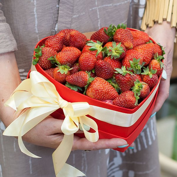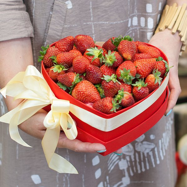 Коробка в виде сердечка с клубникой.