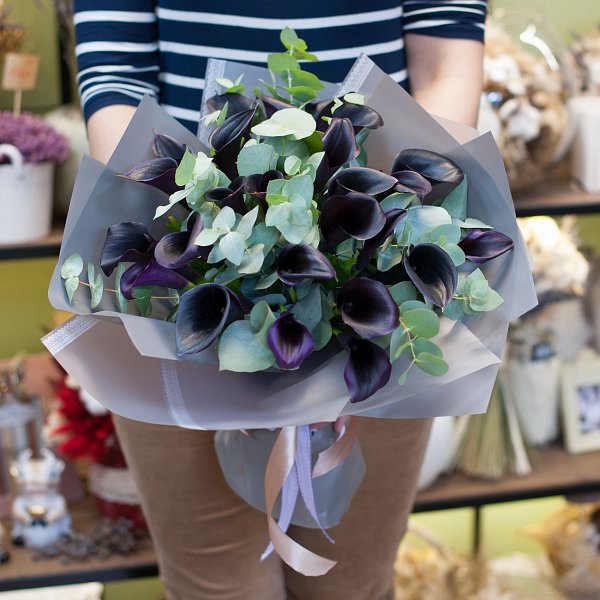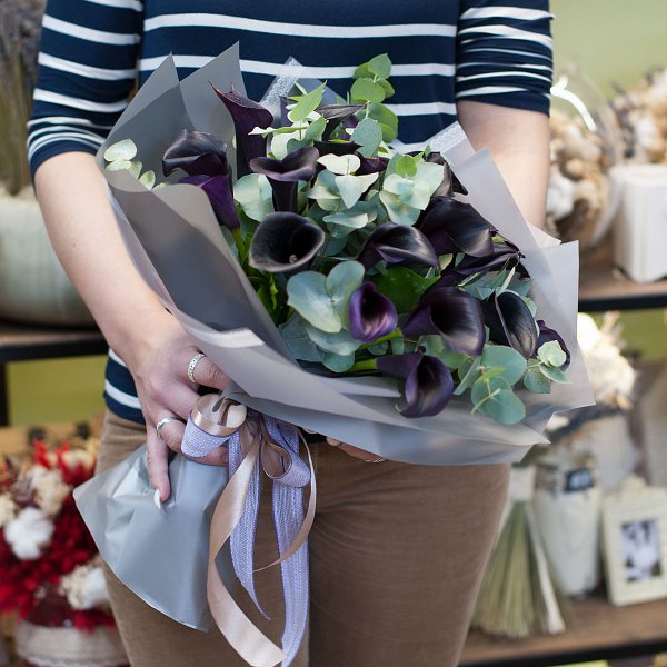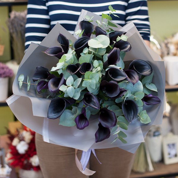 Букет из черных калл, эвкалипта в подарочной упаковке.