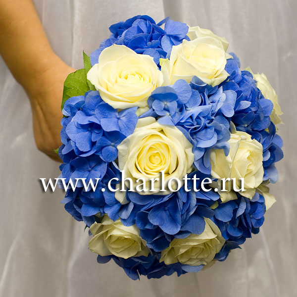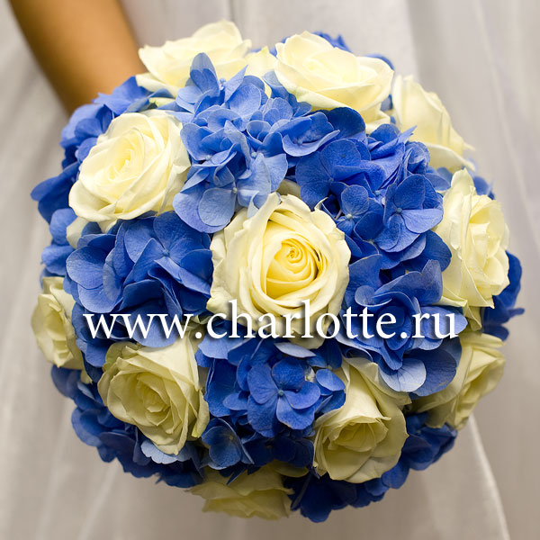 Букет невесты в сине-белых тонах из синей гортензии, белых роз с декоративной зеленью на портбукетнице. По Вашему желанию цветовую гамму букета можно изменить, для этого звоните в наши салоны цветов или указывайте в разделе "комментарии для флориста" при заказе через интернет.