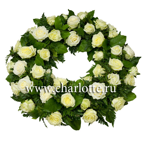 Венок округлой формы из белых роз с зеленью.