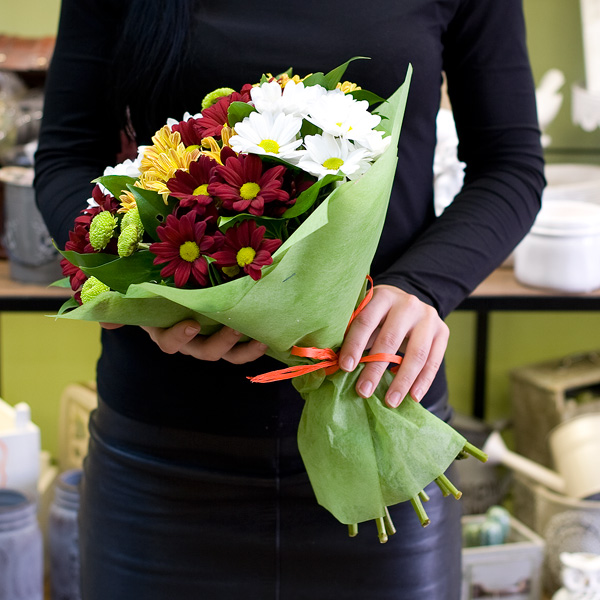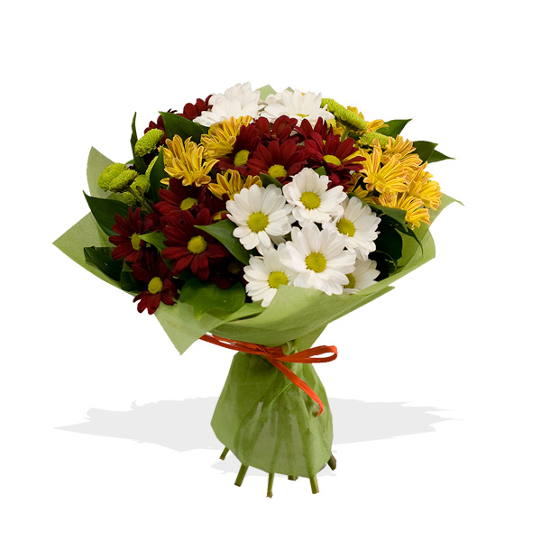 Букет из кустовых хризантем осенних цветов с зеленью в подарочной упаковке. По Вашему желанию цветовую гамму букета можно изменить, для этого звоните в наши салоны цветов или указывайте в разделе "комментарии для флориста" при заказе через интернет.