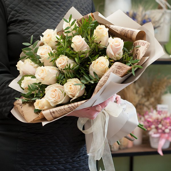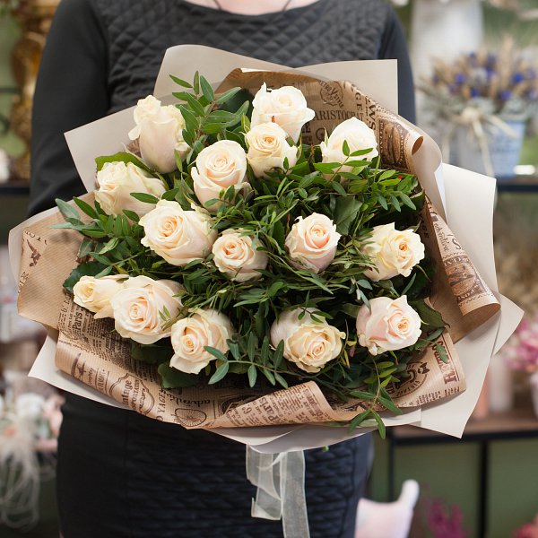Букет из кремовых роз с декоративной зеленью в дизайнерской бумаге крафт.