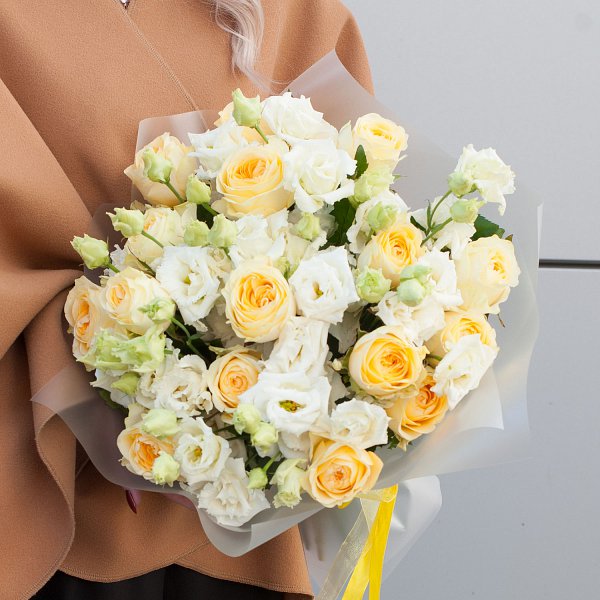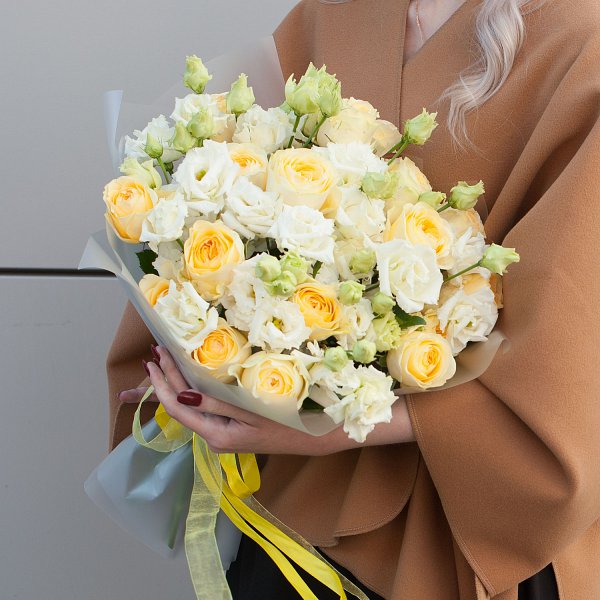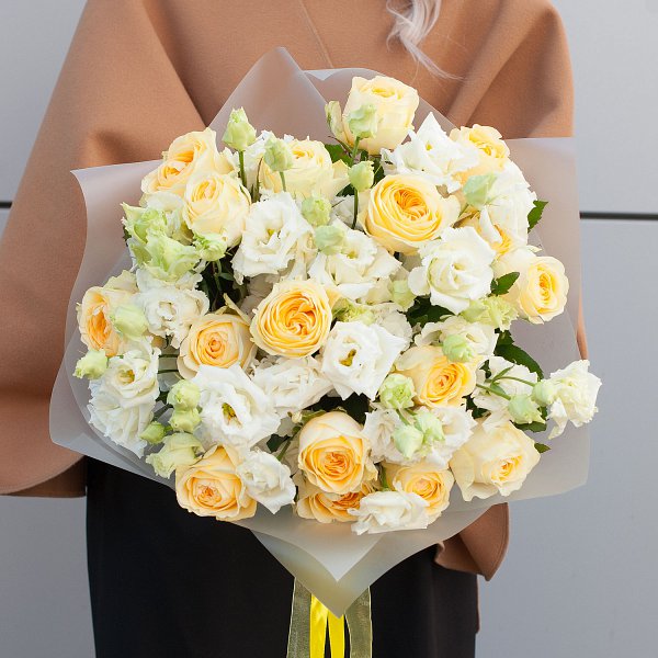 Букет цветов "Медовый" - это сборный букет, состоящий из 27 желтых роз и 10 белых лизиантусов.