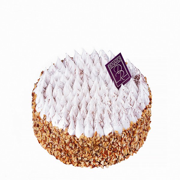 Нежнейший воздушный бисквит, прослоенный заварным кремом с ванилью и ирисом, украшен короной из воздушного безе, обсыпан арахисовым кубиком .