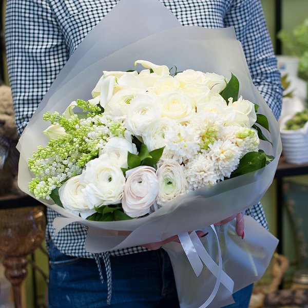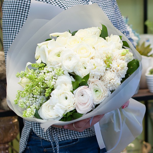 Букет цветов в белых тонах из белой сирени, белых и персиковых ранункулусов, белых гиацинтов, белых роз, белых калл с декоративной зеленью в подарочной упаковке.