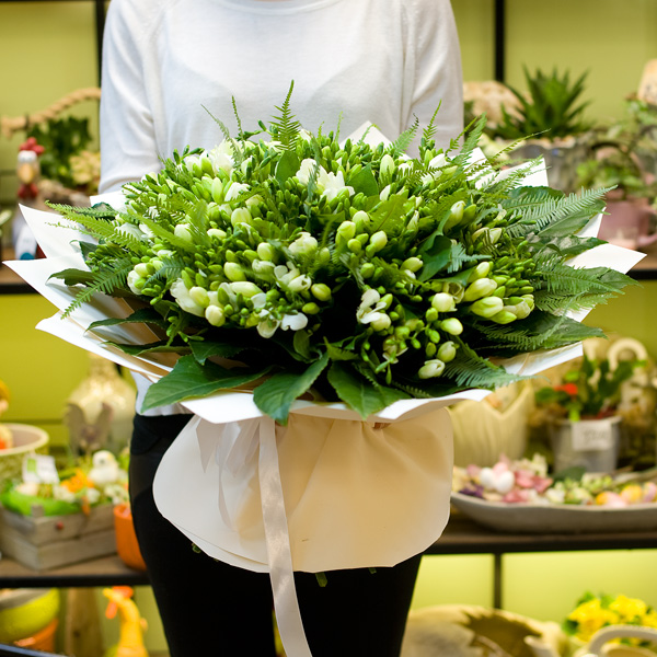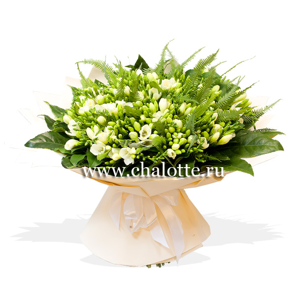 Букет из белых фрезий с декоративной зеленью в подарочной упаковке. По Вашему желанию цветовую гамму букета можно изменить, для этого звоните в наши салоны цветов или указывайте в разделе "комментарии для флориста" при заказе через интернет.