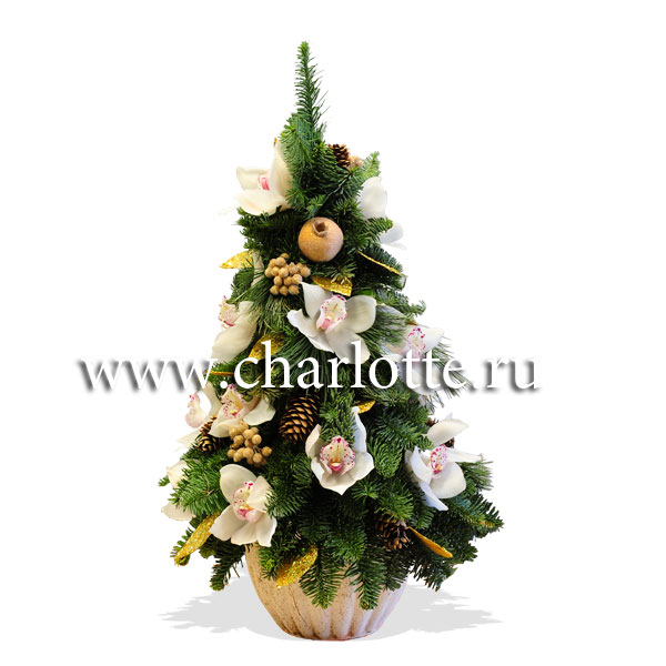 Елочка ручной работы из лапника и белых орхидей с новогодним декором. По Вашему желанию цветовую гамму орхидей можно изменить, для этого звоните в наши салоны цветов или указывайте в разделе "комментарии для флориста" при заказе через интернет.